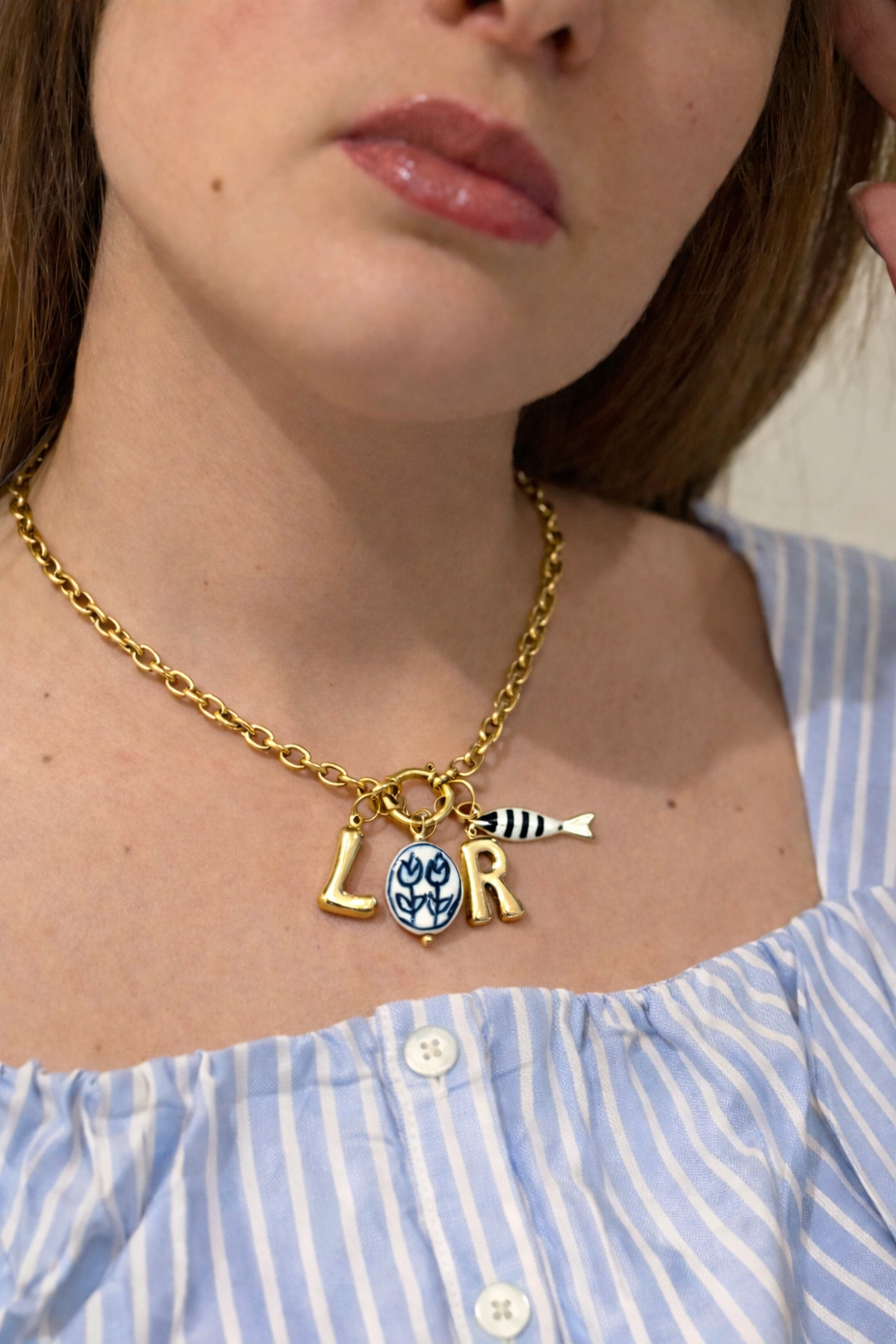 A gold chain designed to carry what matters. Letters, a fish, a flower — symbols chosen with intention. Details that stay close to the skin and to meaning.